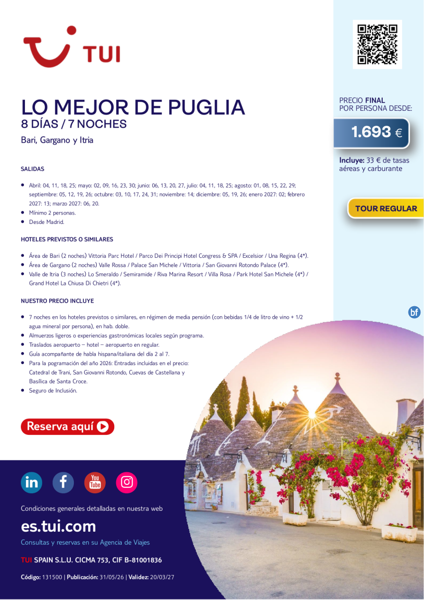 Lo Mejor de Puglia. 8 días / 7 noches. Salidas 2026 y 2027. Tour Regular. Desde 1.693 €